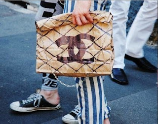 If you can't buy it, make it. Or, even if you can buy it, do it anyway. Paper chanel bag with metal chain was spotted elsewhere on the internet. I couldn't resist posting it, as I think it shows a mix of courage, originality, and cheekiness that is sometimes forgotten in fashion today.
